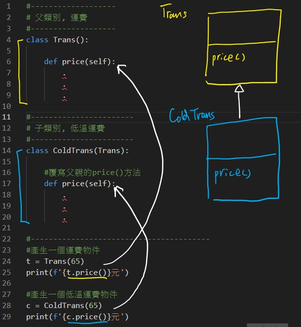 raise ValueError('此低溫包裹尺寸不能運送')第36行的price()覆寫(override)了父親的price()方法。
