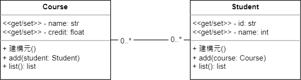 以下是一個雙向關聯的例子,在下方的類別圖中,1門課程登錄了0個或多個學生,一個學生也選修了0門或多門課程,不管從Course或Student類別,都可以連結到與其相關的對方物件。