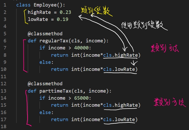 return int(income*cls.lowRate) 第5及12行各宣告一個類別方法。 第6~10行是一個計算一般稅金的類別方法,它用了定義在類別中的highRate及lowRate的類別變數。 第13~17行是一個計算兼職稅金的類別方法,它也用了定義在類別中的highRate及lowRate的類別變數。以下是一個使用它們的例子: